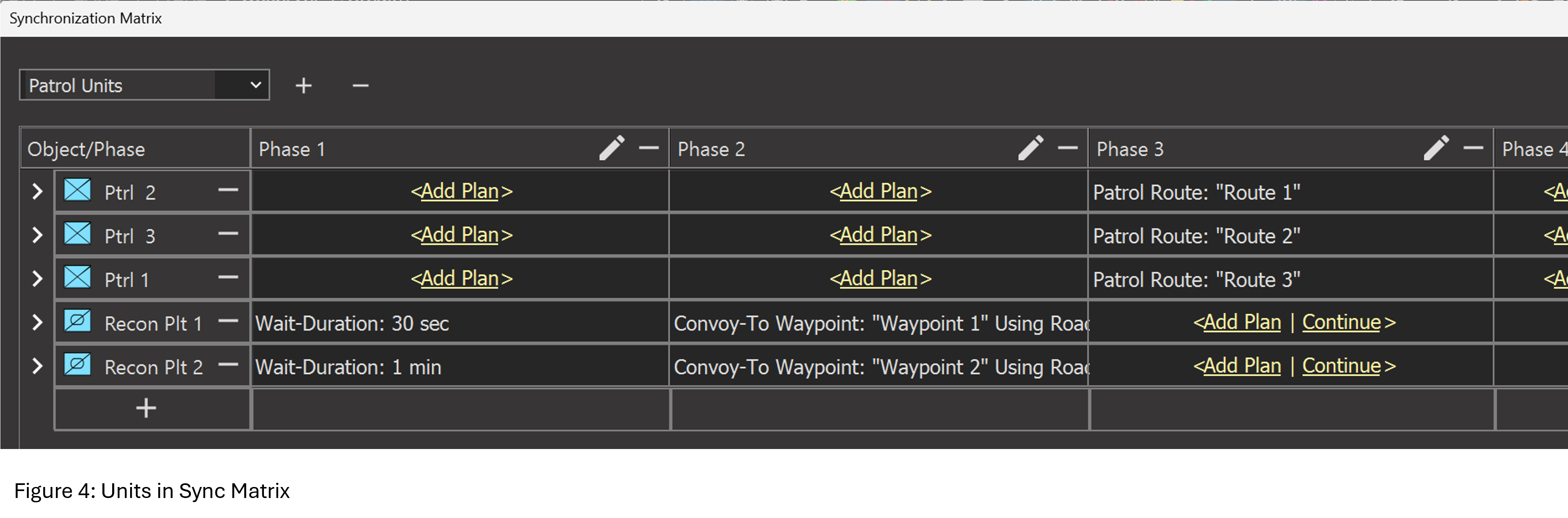 When working at this scale, the challenge isn’t building the behaviors, but rather maintaining control and clarity as the system and scenarios grow. Rather than relying on individual plans scattered across entities, we structured each scenario using Synchronization Matrices. This gave us a centralized way to manage behavior within each scenario, while keeping everything organized and predictable.