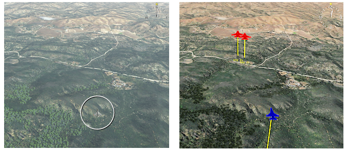 VR-Vantage can display the view from gimbaled visual sensors simulated by VR-Forces, such as a camera on a UAV. The view is displayed in an inset window that has information about the observer mode and area being viewed. The window has its own observer and you can change the observer mode in the view.